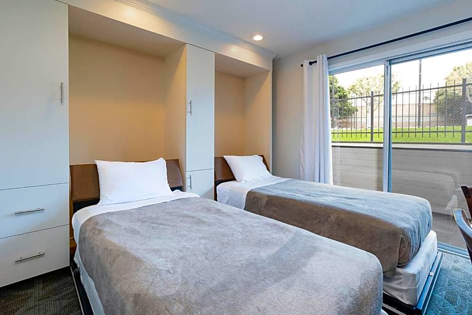 Two single-sized beds that pull down from the wall and a queen-sized sofa bed are featured in the living room.